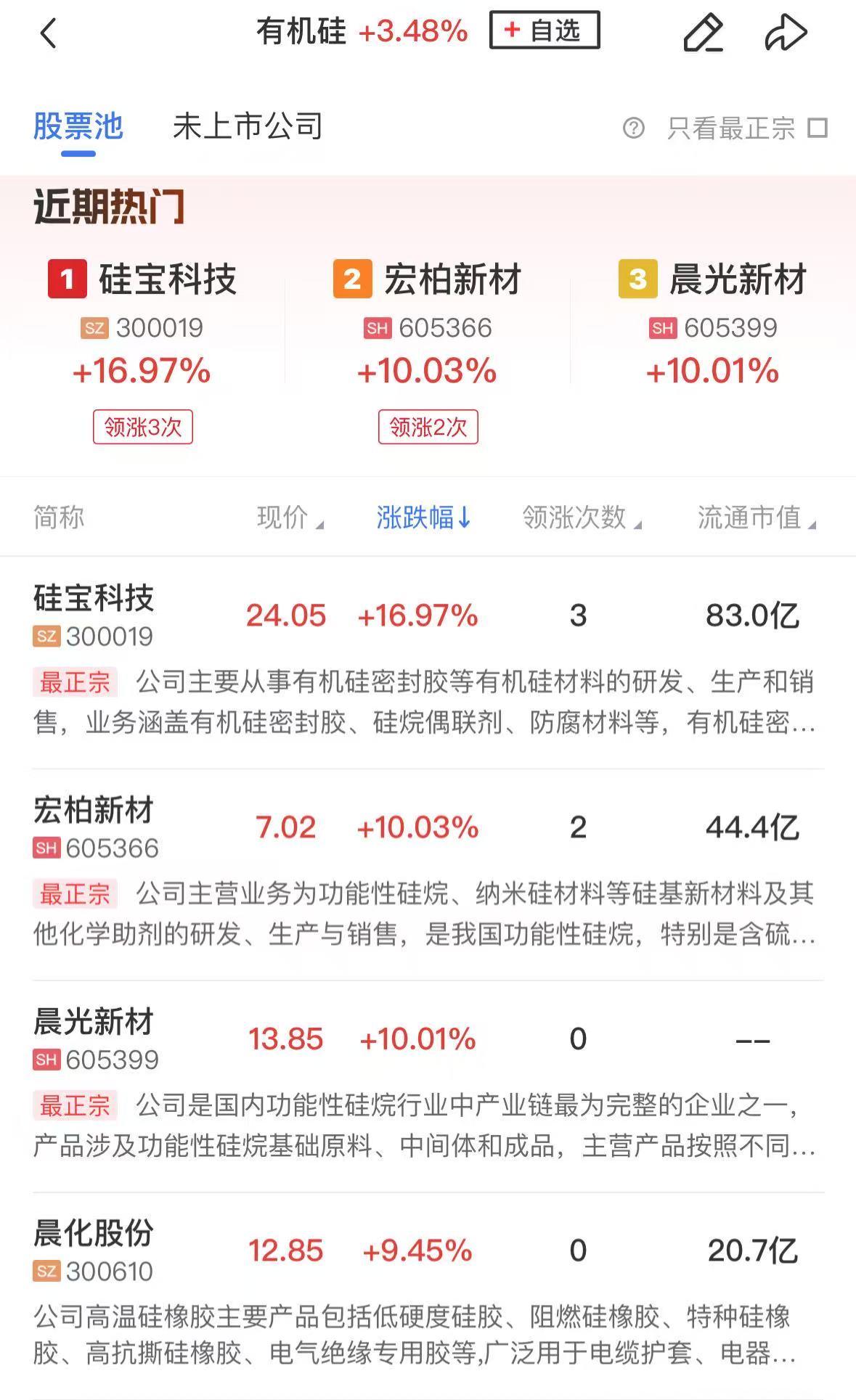 板块上,有机硅概念股涨幅居前,宏柏新材、晨光新材涨停。硅宝科技、晨化股份、润禾新材、东岳硅材涨幅居前。