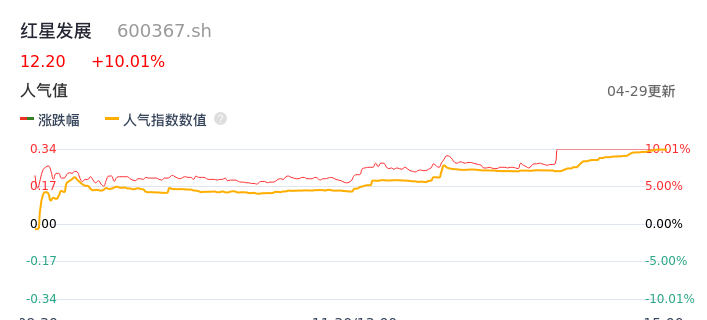 04月29日,红星发展收报12.20,股价涨幅10.01%,成交金额2.05亿元,换手率5.85%。