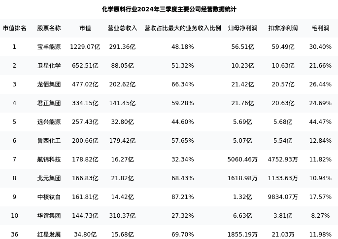 红星发展最新报告期数据为三季度,下表汇总了化学原料行业内市值靠前的公司三季度主要经营数据