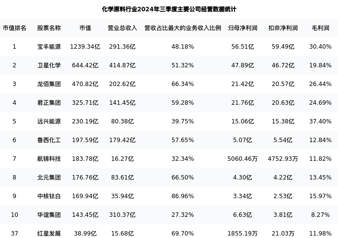 红星发展最新报告期数据为三季度,下表汇总了化学原料行业内市值靠前的公司三季度主要经营数据