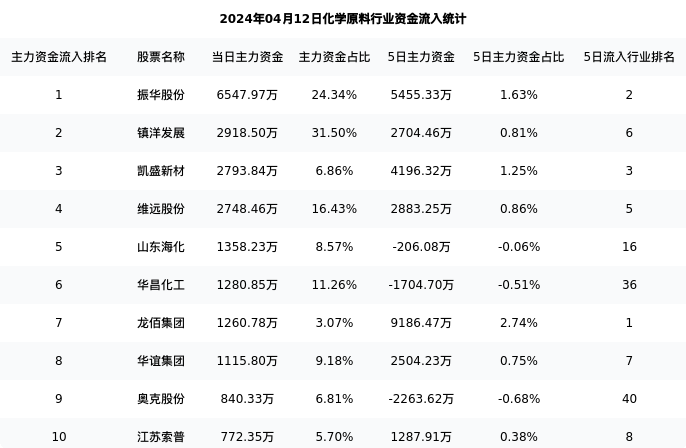 从主力资金流向来看,化学原料行业今日主力资金流入16.49亿元,在所有申万二级行业中排名:118/131。