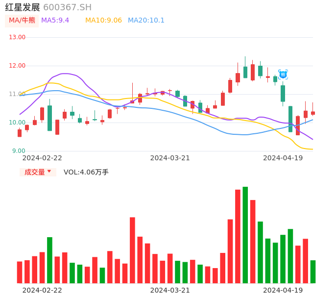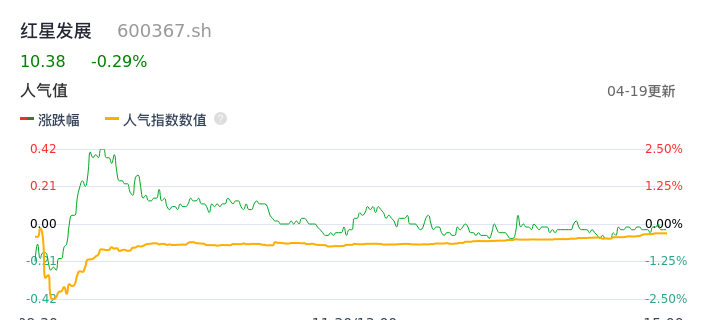 04月19日,红星发展收报10.38,股价涨幅-0.29%,成交金额4234.10万元,换手率1.38%。
