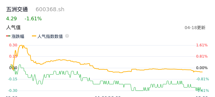 04月18日,五洲交通收报4.29,股价涨幅-1.61%,成交金额1.03亿元,换手率1.92%。