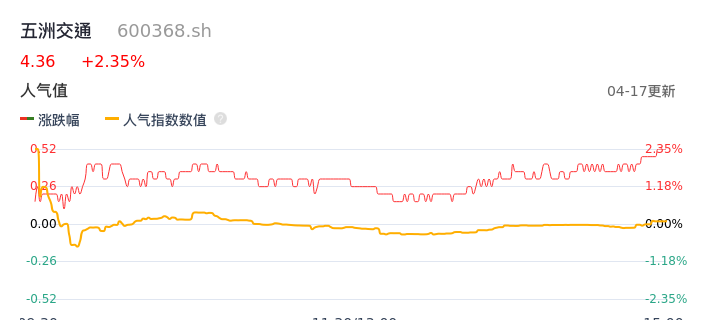 04月17日,五洲交通收报4.36,股价涨幅2.35%,成交金额1.10亿元,换手率2.05%。