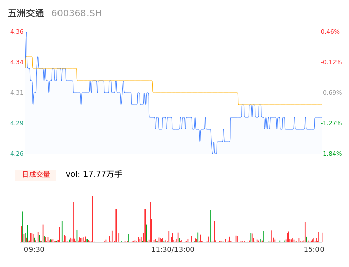 04月22日,五洲交通收报4.29,股价涨幅-1.15%,成交金额7641.89万元,换手率1.43%。