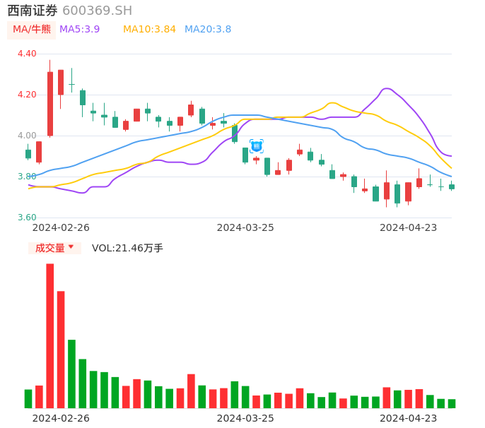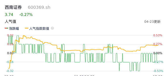 04月23日,西南证券收报3.74,股价涨幅-0.27%,成交金额8045.77万元,换手率0.34%。