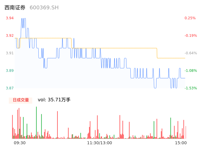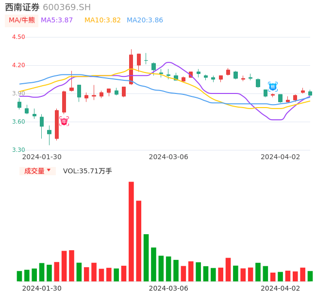 04月02日,西南证券收报3.88,股价涨幅-1.27%,成交金额1.39亿元,换手率0.57%。