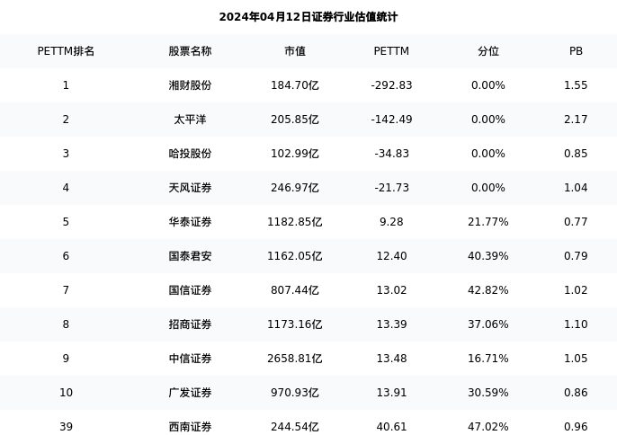 从估值角度看:西南证券最新市盈率PETTM为40.61,在行业内排名35/50,处于47.02分位。