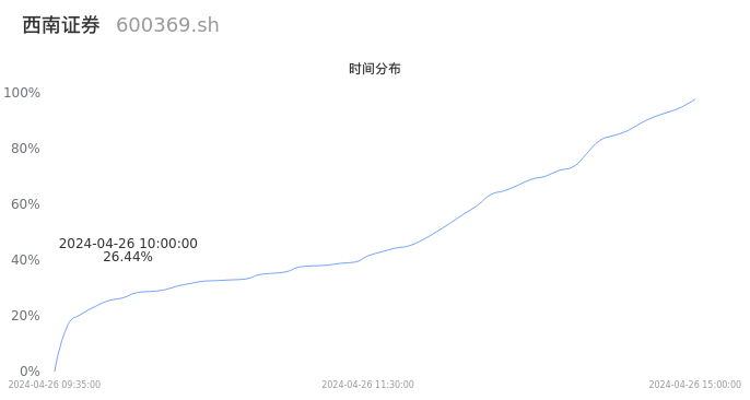 600369西南证券2024年04月26日成交100.97万手,成交金额3.89亿元,相较昨日放量78.08万手,换手率1.60%,成交清淡。