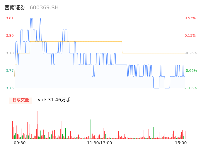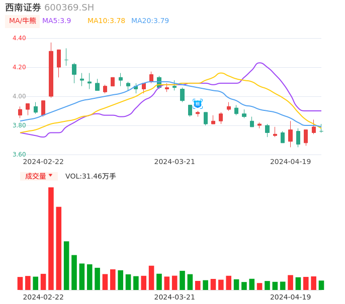 04月19日,西南证券收报3.76,股价涨幅-0.79%,成交金额1.19亿元,换手率0.50%。