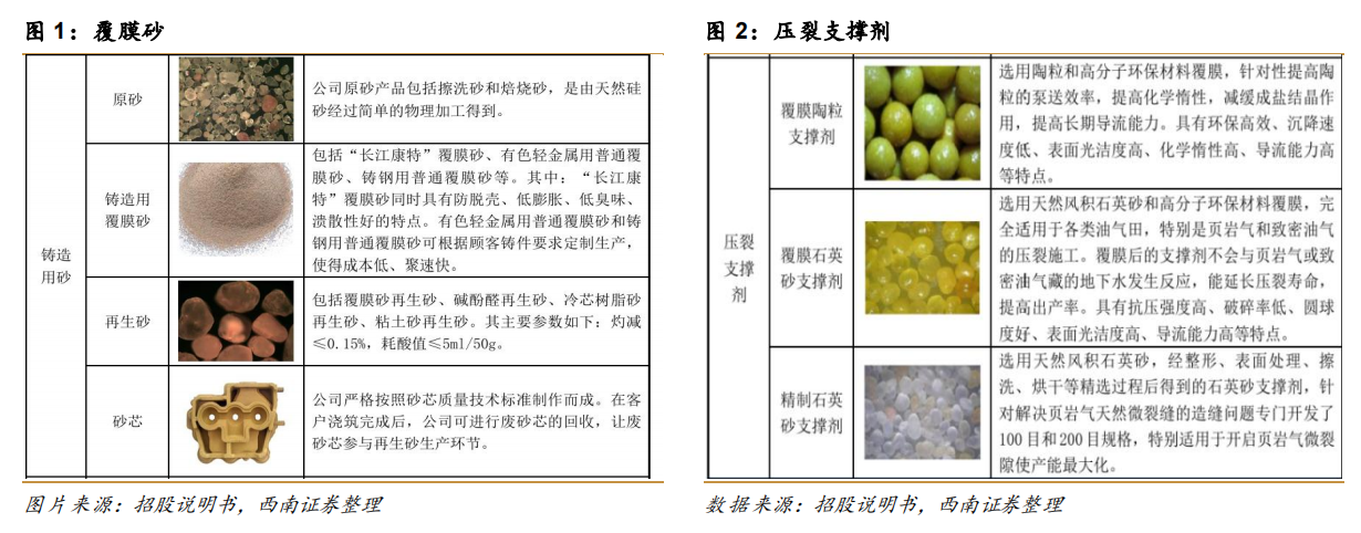 公司是国内大型专业覆膜砂生产供应商及废(旧)砂资源化解决方案提供商,主要从事原砂开采与加工,铸造用覆膜砂、砂芯和铸造辅料生产,铸造废(旧)砂再生技术和设备的研发生产,压裂支撑剂生产。公司产品覆盖覆膜砂全产业链,主要有原砂、铸造用覆膜砂、再生砂、砂芯以及压裂支撑剂。公司铸造用砂主要用于汽车、摩托车、内燃机、农业机械、工程机械等行业的铸件生产;压裂支撑剂主要用于石油、天然气和页岩气开采。