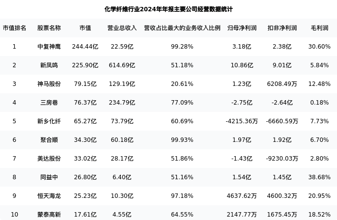 三房巷最新报告期数据为年报,下表汇总了化学纤维行业内市值靠前的公司年报主要经营数据