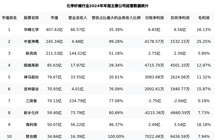 三房巷最新报告期数据为年报,下表汇总了化学纤维行业内市值靠前的公司年报主要经营数据