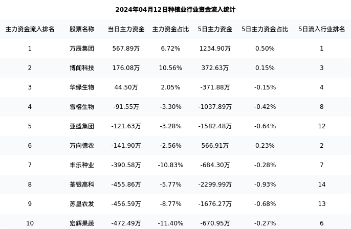 万向德农今日净流出141.90万元,主力占比2.56%,在行业内排名:6/20;5日净流入566.91万元,主力占比0.23%,在行业内排名:2/20。