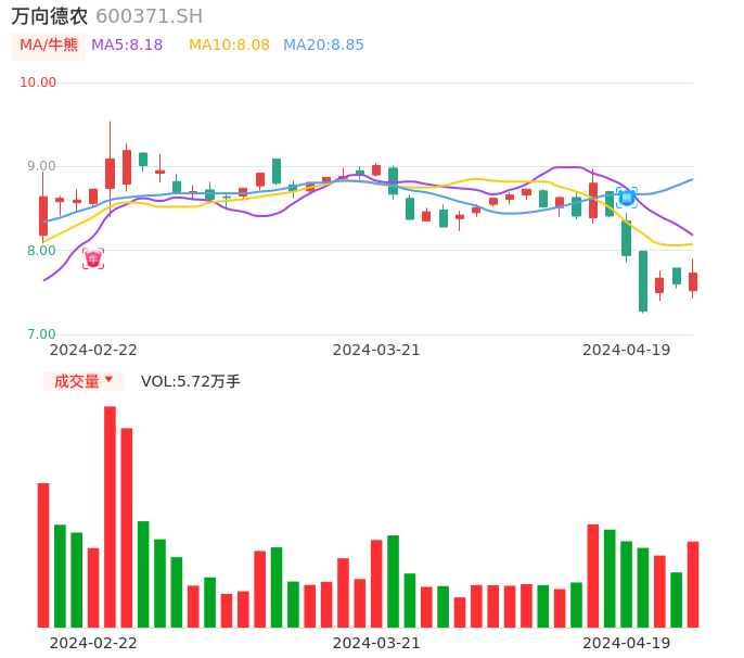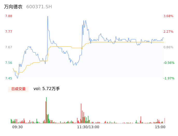 04月19日,万向德农收报7.73,股价涨幅1.71%,成交金额4401.55万元,换手率1.95%。