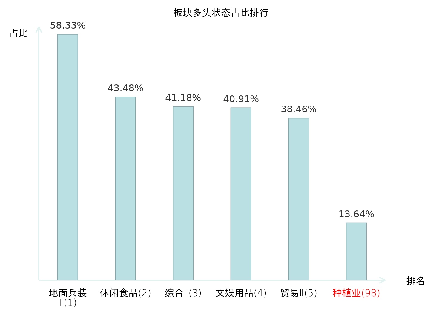 全市场所有行业板块中主力多头状态占比排名中,地面兵装Ⅱ板块位居第一。林业Ⅱ板块名次提升最快,较昨日上升90位。