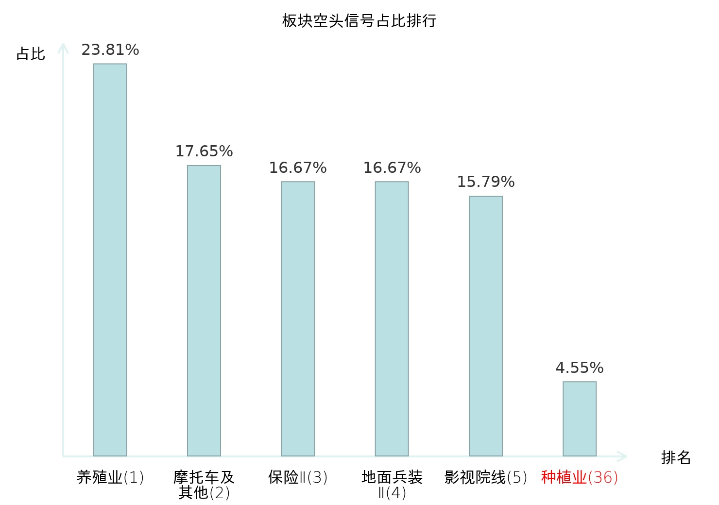 全市场所有行业板块中主力空头信号占比排名中,养殖业板块位居第一。养殖业板块名次提升最快,较昨日上升114位。