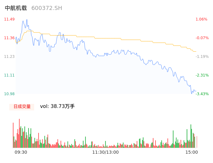 04月16日,中航机载收报11.00,股价涨幅-3.25%,成交金额4.36亿元,换手率0.81%。