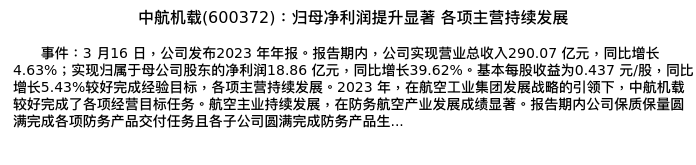 值得注意的是:2024年04月长城证券的付浩/于夕朦/孙培德分析师,首次发布关于中航机载的研究报告,标题为:中航机载(600372):归母净利润提升显著 各项主营持续发展。