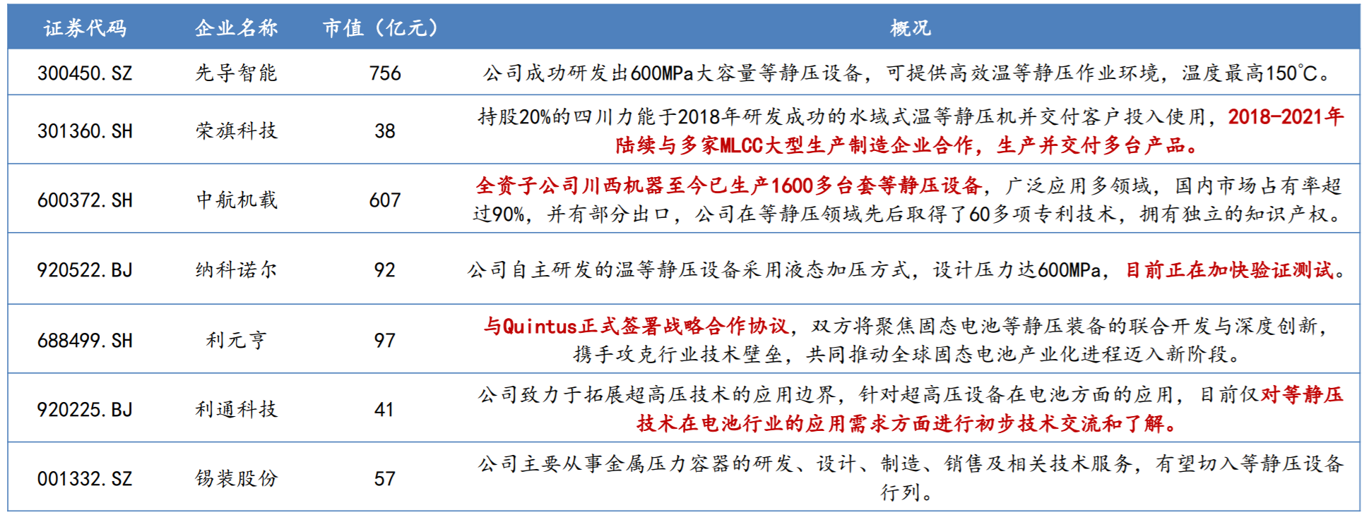 利元亨:国内领先的锂电设备龙头企业,近年来重点布局固态 电池核心设备。等静压设备公司已正式立项并展开研发工作,目前积极推进相关技术研究,同时也与行业内多家具备压力容器制造经验的企业开展合作。
