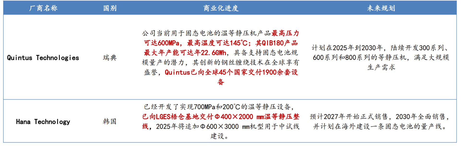 Hana Technology(韩国):韩国知名的高端设备制造商,专注于新能源材料 加工设备领域,其等静压设备专为硫化物固态电池优化设计,具备精准的温压协同控制功能。已经开发了实现 700MPa 和 200℃的温等静压设备,已向 LGES 梧仓基地交付 Φ400×2000mm 温等静压整线,2025 年将追加 Φ600×3000mm 机型用于中试线建设。同时,公司预计 2027 年开始正式销售,2030 年全面销售,并计划在海外建设一条固态电池的量产线。另外,三星 SDI 天安工厂和 LGES 的核心设备供应商 Mplus,其温等静压设备据悉也已经出货 LGES 中试线。