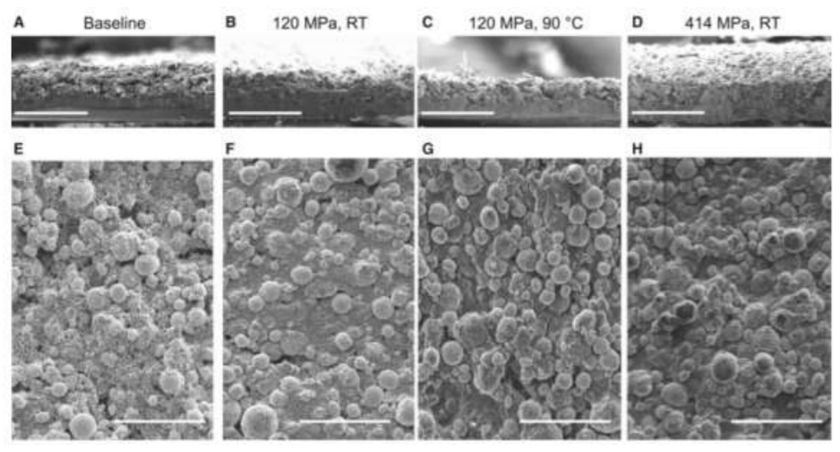 1、 提升电极密度,增加粒子接触面积:由实验结果得知,120MPa、90℃等静压设备比120MPa设备效果更好,414MPa设备比 120MPa设备效果更好,即温度或者压力提升均能够助力材料内部致密度提升,使粒子之间分布更加紧密,同时,也可以侧面证明,对比冷等静压和热等静压,温等静压更加适合用于固态电池中。