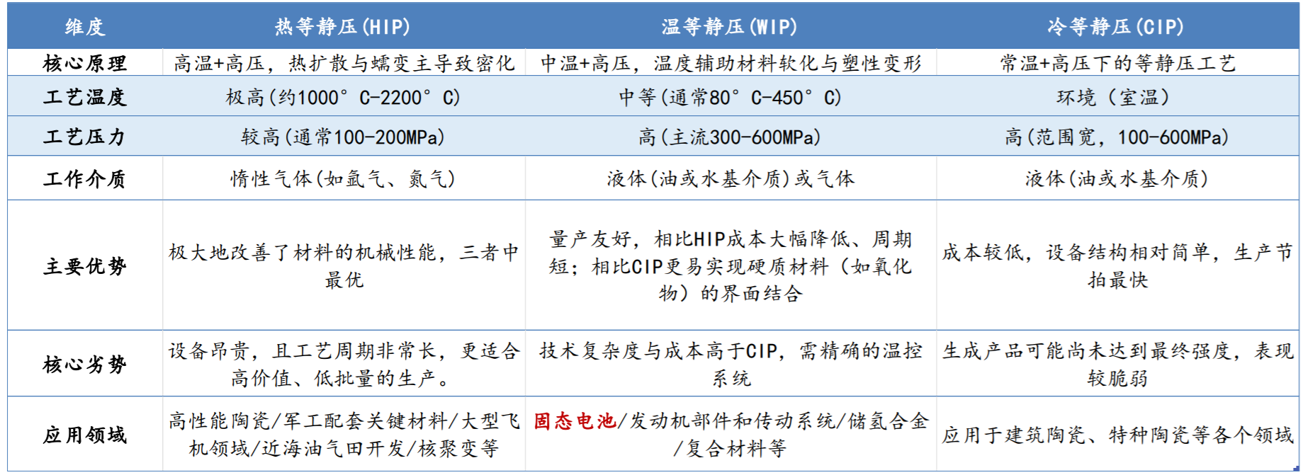 从应用场景看,目前下游主要包括航空航天、医疗设备、国防、能源(包括核能)、汽车以 及用于电子、陶瓷和化工的先进材料制造。未来等静压设备可拓展至固态电池中。在固态电池的生产中引入等静压工艺,可以精准控制电极密度、厚度以及孔隙率等关键参数,并使得固态电池的电极和电解质材料紧密的结合在一起,优化界面接触,同时降低内部电阻,提高固态电池的离子电导率和机械强度等,也可减少固态电池生产工序,降低生产成本。
