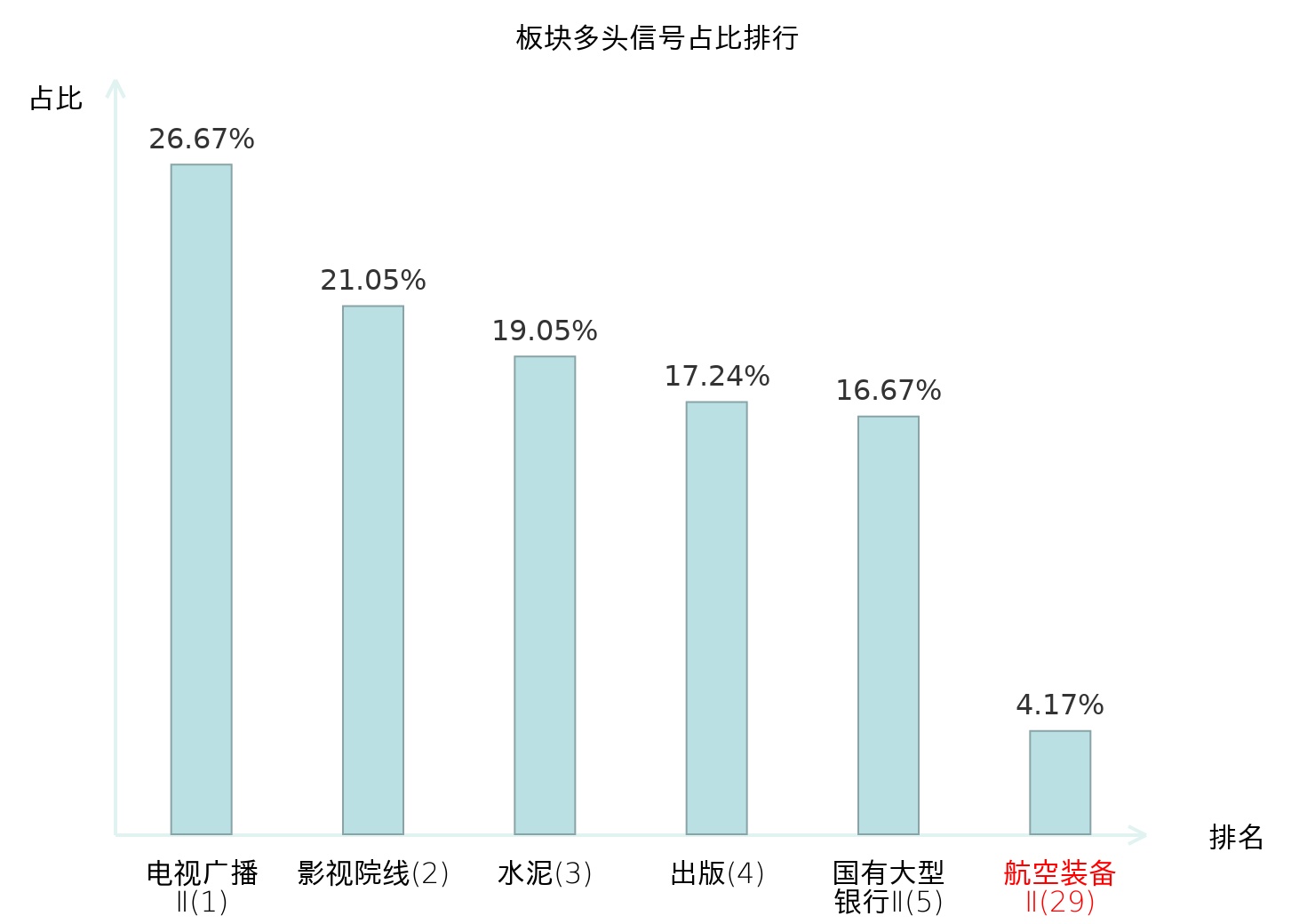 全市场所有行业板块中主力多头信号占比排名中,电视广播Ⅱ板块位居第一。国有大型银行Ⅱ板块名次提升最快,较昨日上升118位。