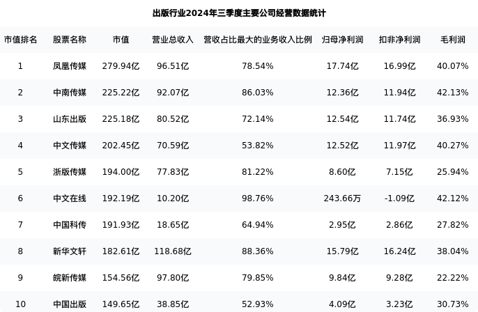 中文传媒最新报告期数据为三季度,下表汇总了出版行业内市值靠前的公司三季度主要经营数据