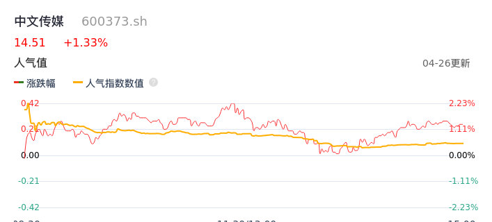 04月26日,中文传媒收报14.51,股价涨幅1.33%,成交金额2.96亿元,换手率1.51%。