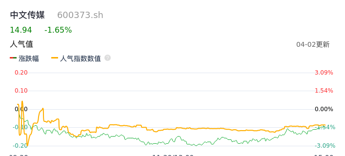 04月02日,中文传媒收报14.94,股价涨幅-1.65%,成交金额3.23亿元,换手率1.60%。