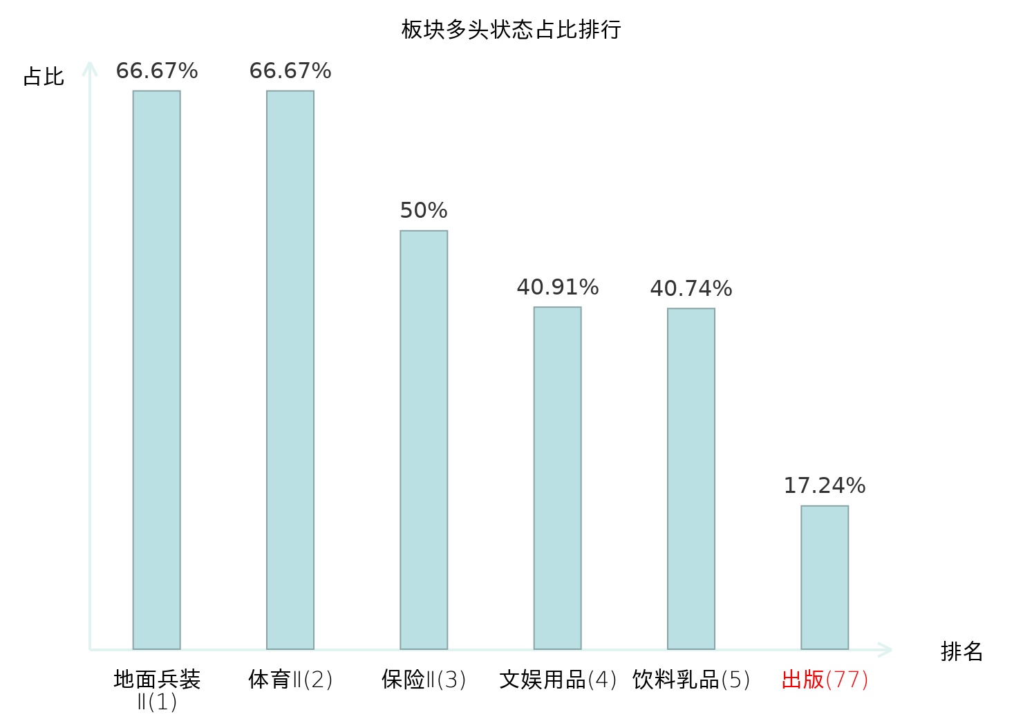 全市场所有行业板块中主力多头状态占比排名中,地面兵装Ⅱ板块位居第一。电视广播Ⅱ板块名次提升最快,较昨日上升82位。