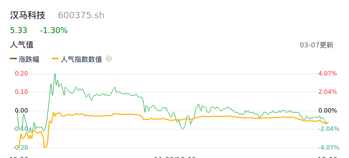 03月07日,汉马科技收报5.33,股价涨幅-1.30%,成交金额1.72亿元,换手率4.85%。