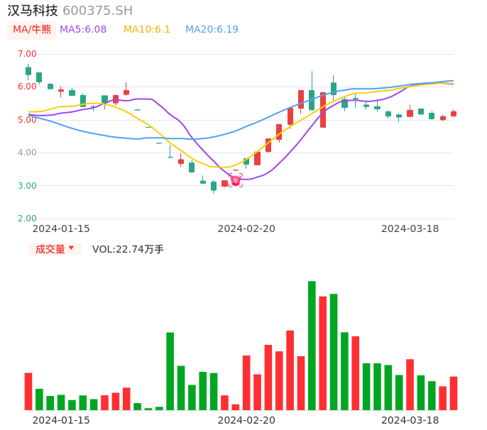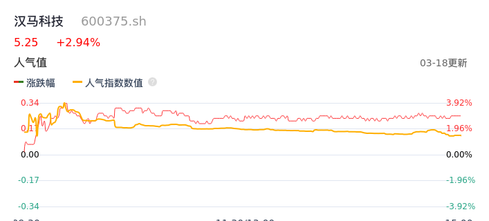 03月18日,汉马科技收报5.25,股价涨幅2.94%,成交金额1.19亿元,换手率3.48%。