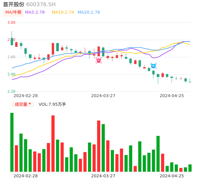 04月25日,首开股份收报2.31,股价涨幅-0.43%,成交金额1851.58万元,换手率0.31%。