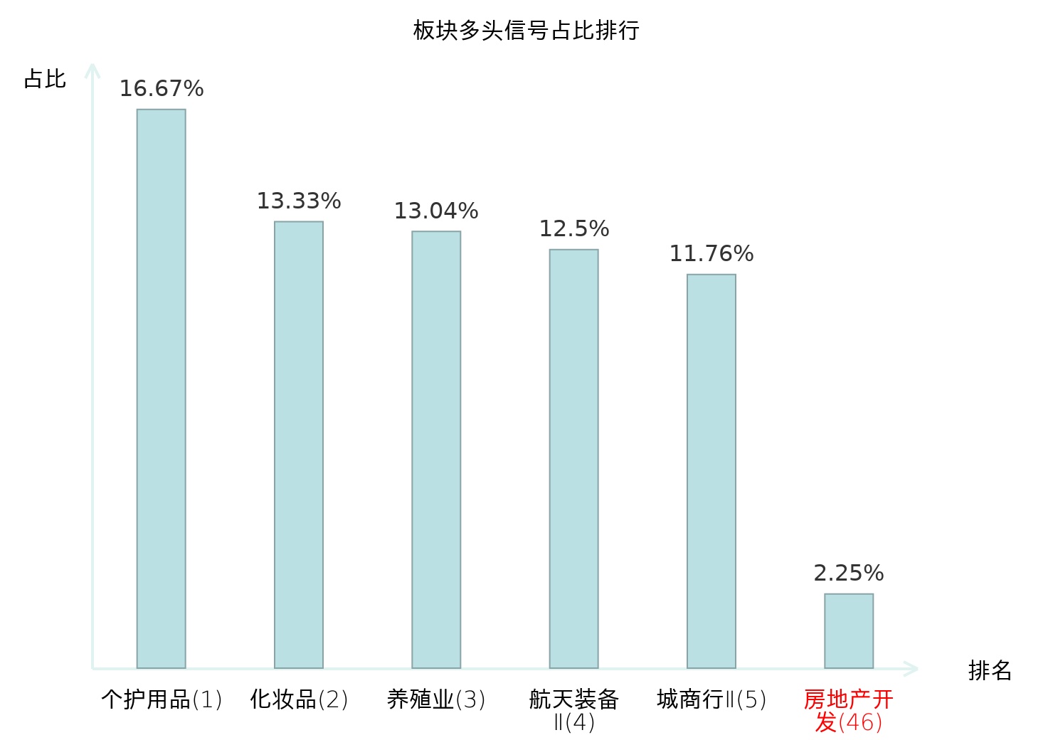 全市场所有行业板块中主力多头信号占比排名中,个护用品板块位居第一。航天装备Ⅱ板块名次提升最快,较昨日上升118位。