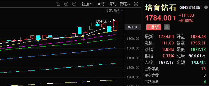 除了红利几个板块外,下午最亮眼的当属培育钻石概念。消息面上2025一带一路国际先进材料大会将于10月20日至23日在宁波举办,同时在第十五届中国河南国际投资贸易洽谈会上,力量钻石正式宣布成功培育出重达156.47克拉的人工钻石原石,而这个消息是盘前的,到了下午才发酵,拉升。上午没有低吸的,下午再追涨的,又失去了成本优势,明日开盘则要谨慎参与。
