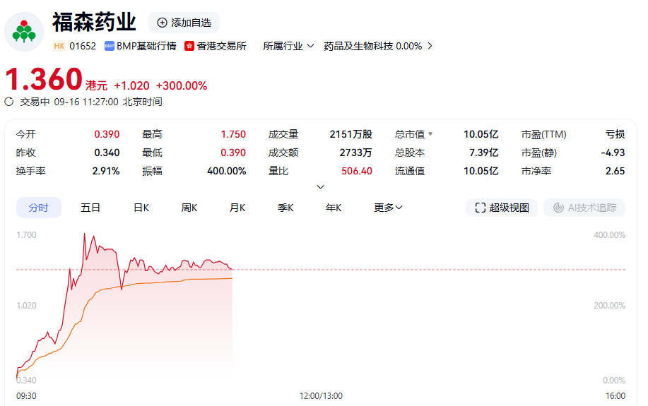 其他大幅波动的港股中,福森药业异动拉升,盘中涨幅一度超过400%。