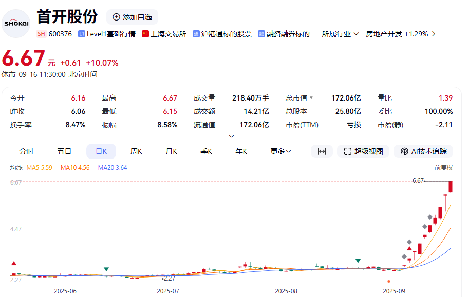 首开股份昨晚发布关于股票交易风险提示的公告。公告称,自2025年9月3日至9月12日期间,公司股票收盘价格涨幅偏离值累计达到100%,根据《上海证券交易所交易规则》有关规定,属于股票交易严重异常波动情形。公司于2025年9月13日发布了《关于股票交易异常波动暨严重异常波动的公告》。9月15日公司股票继续涨停。近期公司股票交易呈现出交易量明显增长、换手率大幅提升、股东人数显著增长、个别机构股东出现减持清仓等情况,股价存在短期上涨过快可能出现的下跌风险。公司表示,请广大投资者注意二级市场交易风险,理性决策,审慎投资。
