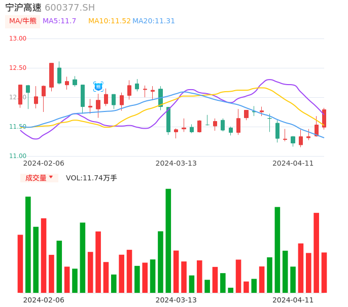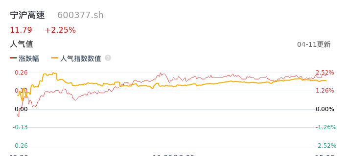 04月11日,宁沪高速收报11.79,股价涨幅2.25%,成交金额1.38亿元,换手率0.31%。