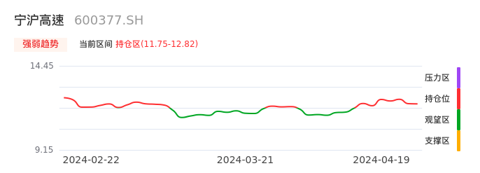 我们来看一下该股的九方特色指标强弱趋势的情况:宁沪高速自04月11日从观望区上穿到持仓区。股价近期在多头区域持续强势上扬,上升动能仍较为充足,可积极关注。后续重点关注上方压力位:12.82元是否能突破上攻。