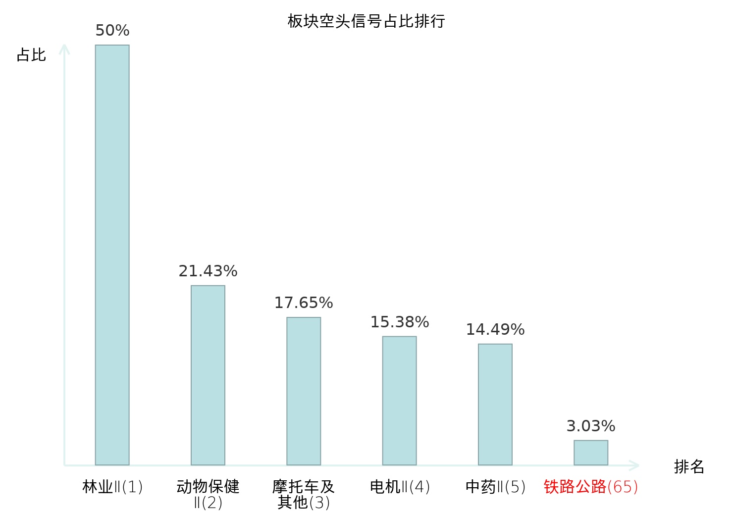 全市场所有行业板块中主力空头信号占比排名中,林业Ⅱ板块位居第一。动物保健Ⅱ板块名次提升最快,较昨日上升109位。