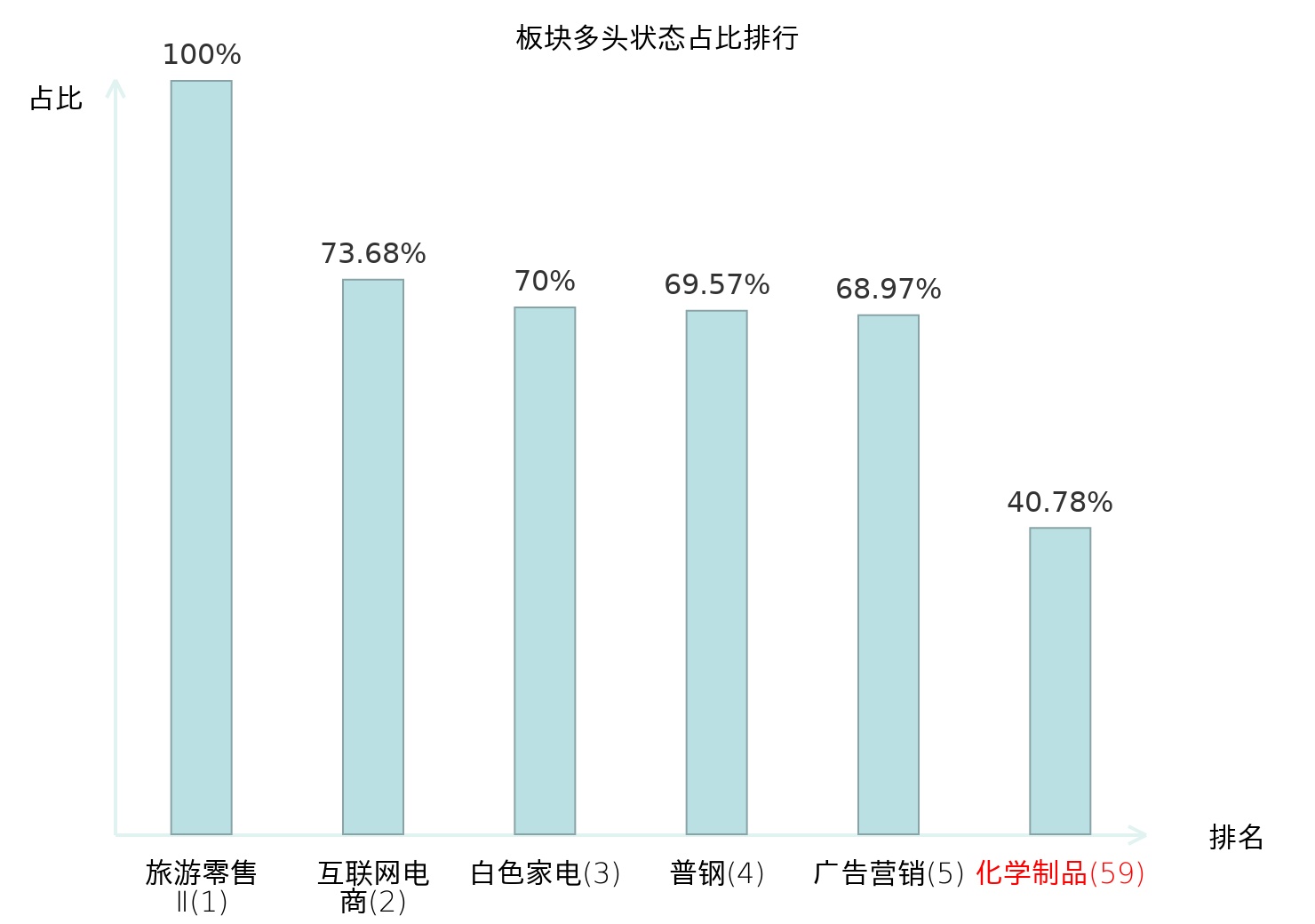 全市场所有行业板块中主力多头状态占比排名中,旅游零售Ⅱ板块位居第一。其他家电Ⅱ板块名次提升最快,较昨日上升66位。