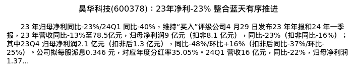 值得注意的是:2024年04月华泰证券的庄汀洲/张雄分析师,首次发布关于昊华科技的研究报告,标题为:昊华科技(600378):23年净利-23% 整合蓝天有序推进。