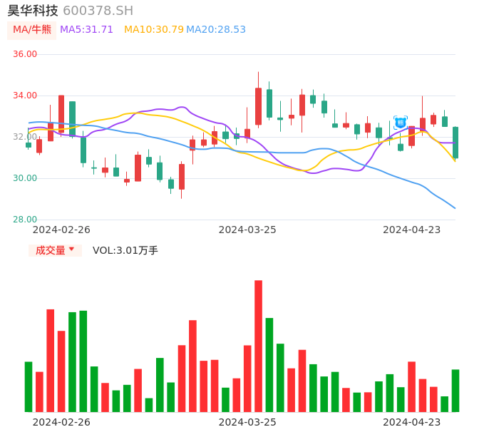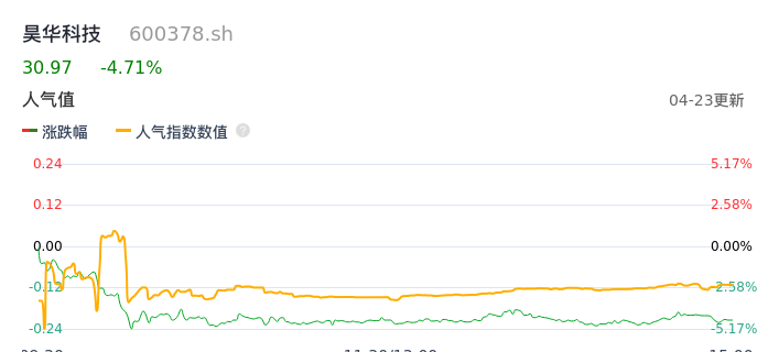 04月23日,昊华科技收报30.97,股价涨幅-4.71%,成交金额9386.93万元,换手率0.33%。