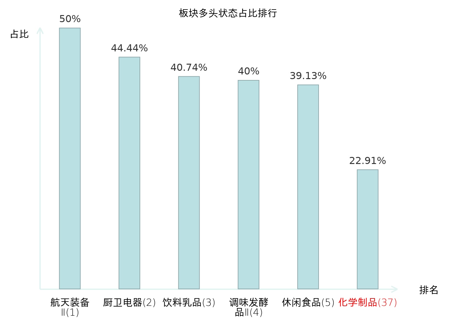 全市场所有行业板块中主力多头状态占比排名中,航天装备Ⅱ板块位居第一。林业Ⅱ板块名次提升最快,较昨日上升92位。