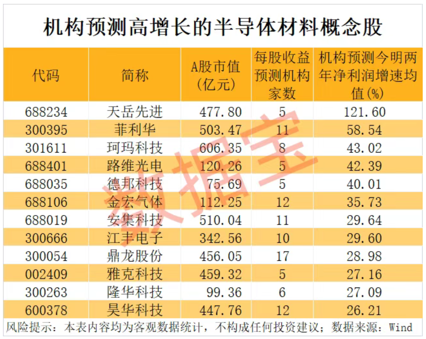 据数据宝统计,根据5家及以上机构一致预测,2026年、2027年净利润增速均有望超20%的半导体材料概念股有12只。