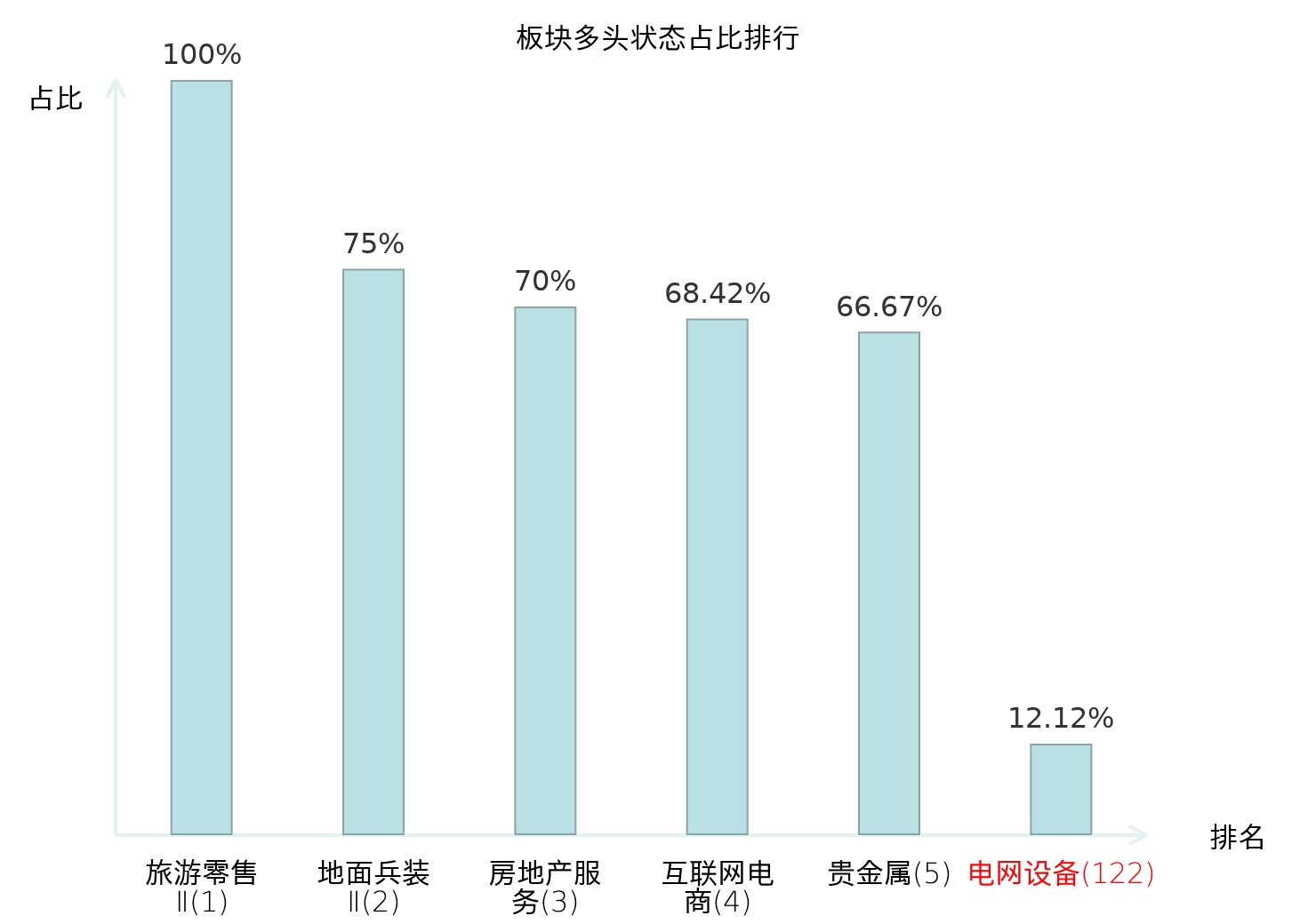 全市场所有行业板块中主力多头状态占比排名中,旅游零售Ⅱ板块位居第一。白色家电板块名次提升最快,较昨日上升65位。