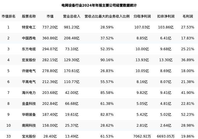 宝光股份最新报告期数据为年报,下表汇总了电网设备行业内市值靠前的公司年报主要经营数据