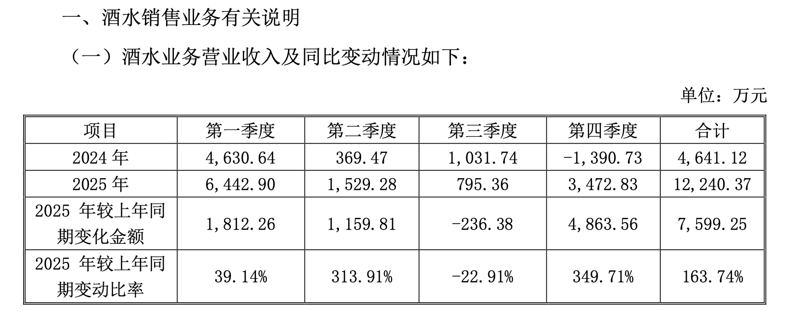从行业规律来看,尽管2025年第四季度白酒行业整体趋势未明显向好,但第四季度至次年春节前仍是行业传统销售旺季,受元旦、春节等节日消费需求带动,终端动销和渠道补货意愿通常会有所增强。由此,第四季度酒水发货及收入环比二、三季度增长,符合此行业季节性规律。